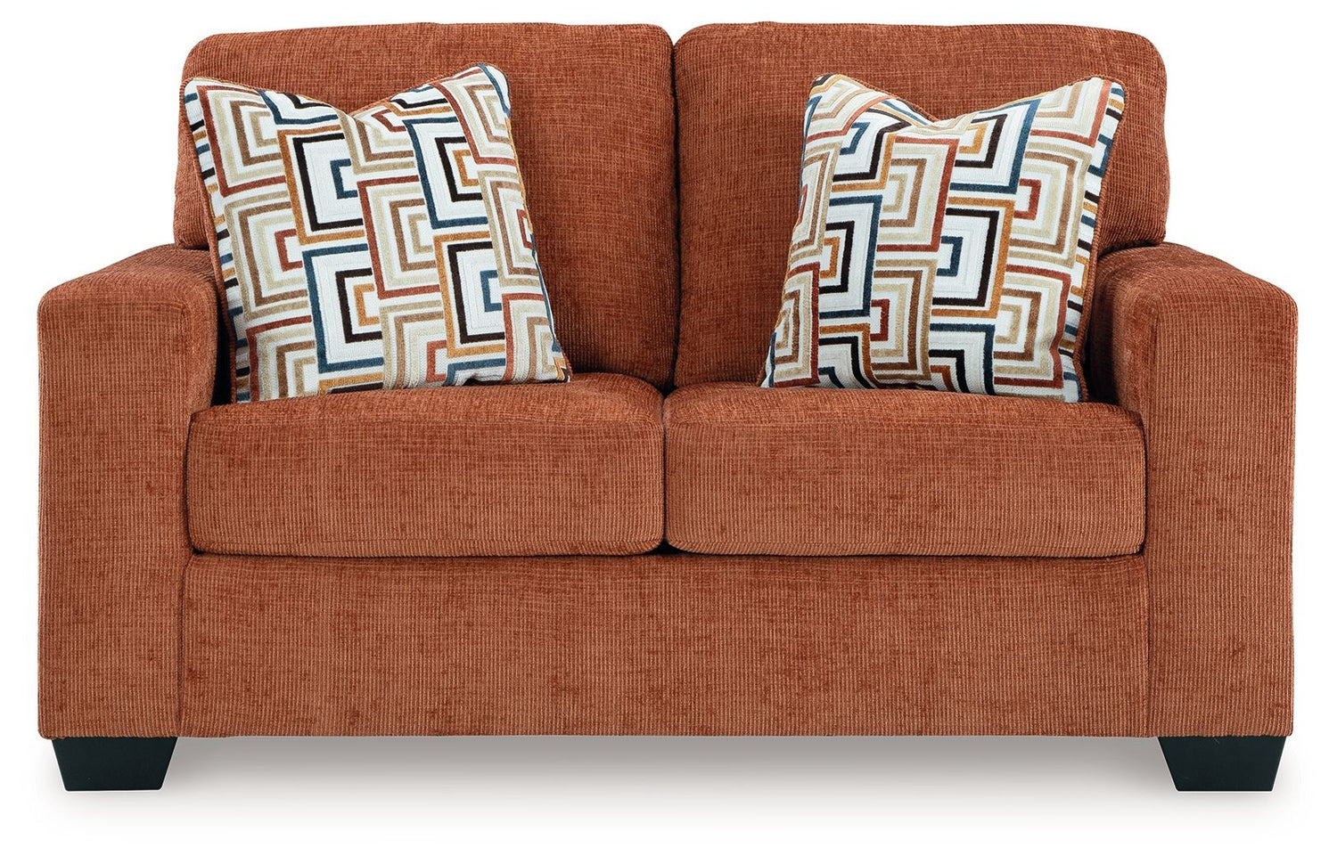 Looking to make a bold statement with color? Liven up your living room with this loveseat. Its trend-right upholstery adds a playful pop of color to your decor. Bold and eclectic accent pillows complete the look. Pairing posh style with everyday comfort, this piece is a welcome addition to contemporary spaces.