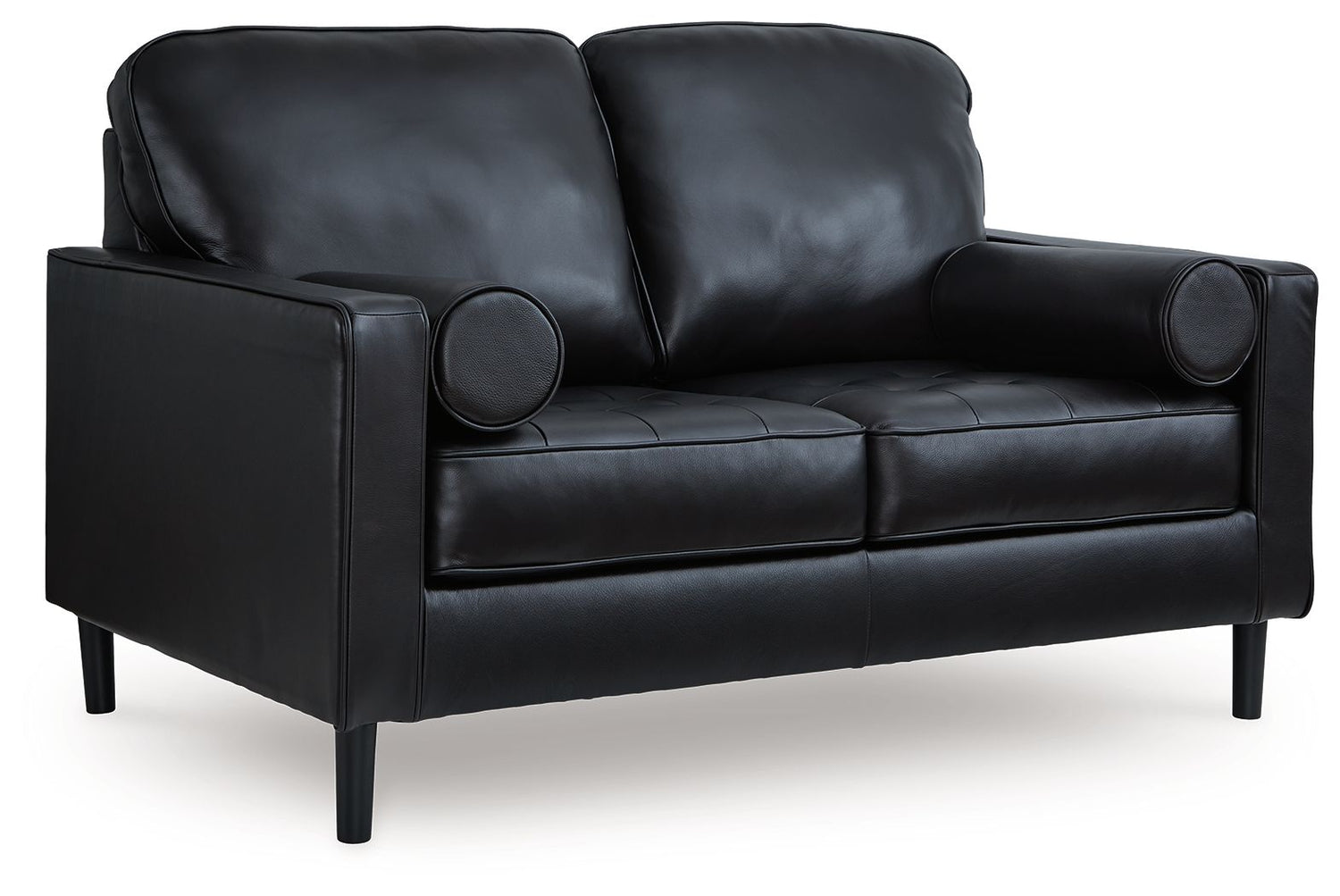 This loveseat embodies timeless mid-century elegance with its linear design, sleek track arms and tapered legs. Skillfully matched leather and faux leather upholstery adds a luxurious touch to the overall look. Experience endless style opportunities for today's living spaces.
