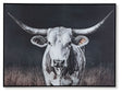 Add homespun charm to modern farmhouse and casual spaces. A longhorn cow takes center stage in this wall art, its white coat contrasting beautifully against the dark background tones. A sleek black frame completes the look.