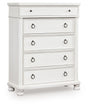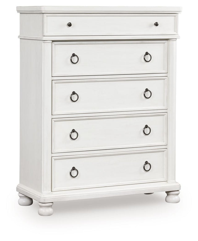 Taking a laid-back approach to casual traditional design, this artfully crafted chest of drawers combines classic elements with a clean modern approach. Its rubbed antiqued finish exudes a comfy, timeless appeal that's sure to carry you away to a dreamy time and place. Simple round metal knobs and ring pulls on the chest's spacious drawers make just the right statement.
