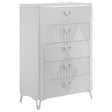 With a sleek high gloss finish and sculptural texture, this five-drawer chest makes a striking addition to the modern bedroom. Its geometric drawer fronts feature ribbed V-patterns that shift across each tier, accented by polished chrome U-shaped pulls. The top drawer is lined in black felt for delicate storage, while all drawers operate smoothly on 45mm ball bearing glides. Elevated on tapered chrome-finished legs, this chest offers elevated storage with sharp visual impact.