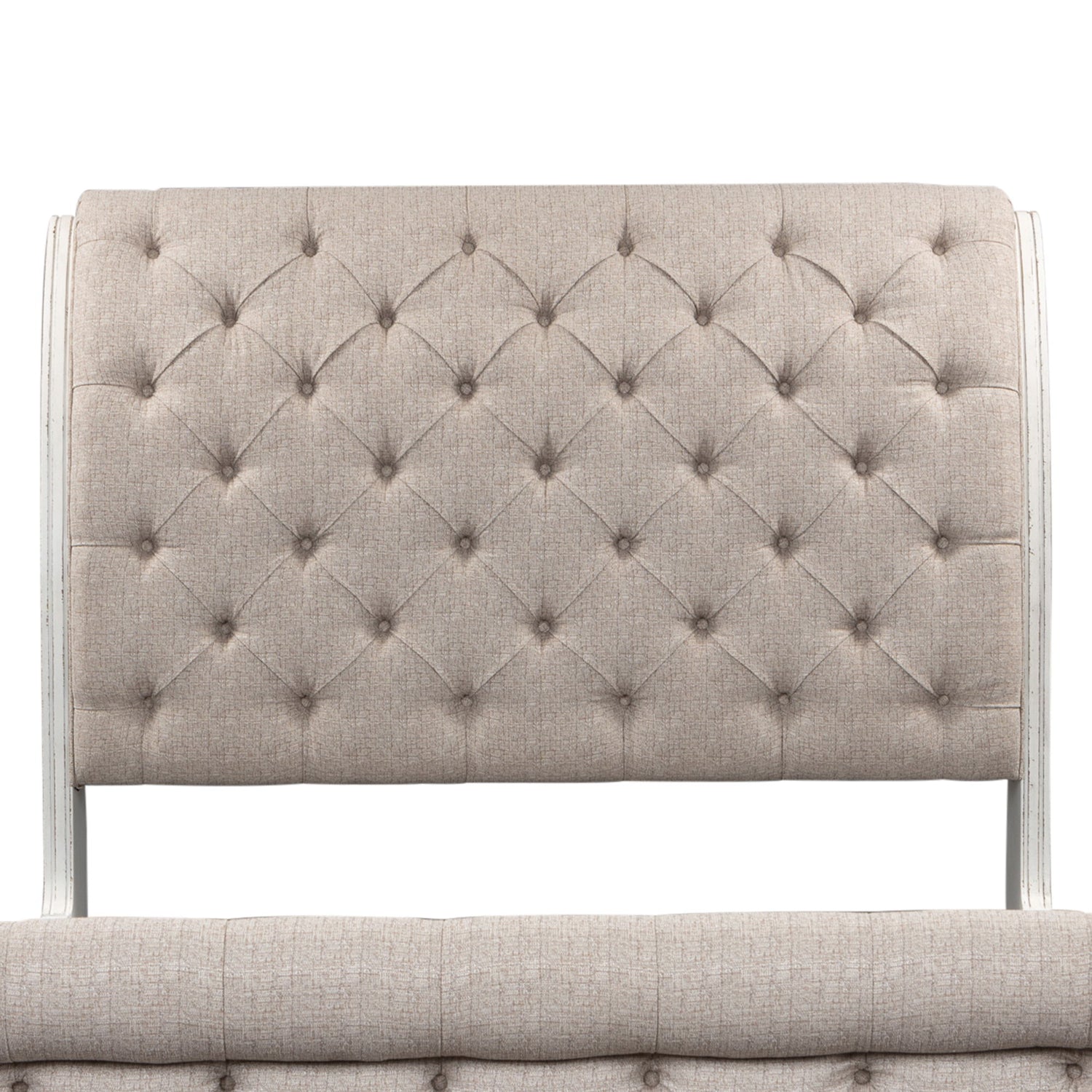 Accent your bedroom with the perfect blend of European Traditional design and casual appeal using the Magnolia Manor Sleigh Upholstered headboard. Finished in a weathered brown and antique white finish with heavy chipping combination this piece is crafted of poplar solids and white oak and birch veneers.The upholstered headboard is button tufted in a chenille fabric laced with tones of white, tan and brown threads and features a rolled top along with a shaped panel for definition and character.