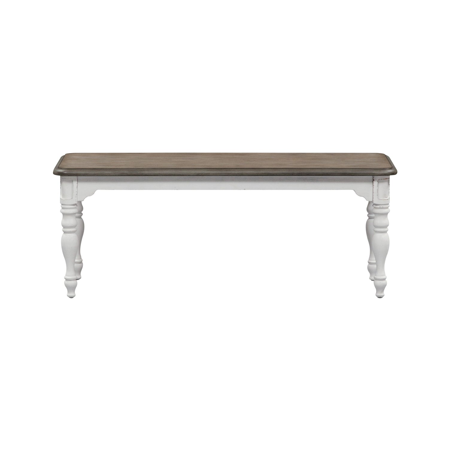 Sit in comfort with the Magnolia Manor dining bench. Crafted of poplar solids with white oak and birch veneers, this piece features the perfect blend of European design, a wooden seat finished in a weathered brown with whitewash, softly rounded corners, and beautifully turned legs. Warm antique finishes and artistic distressing along with grand scale create a piece to be passed to generations.