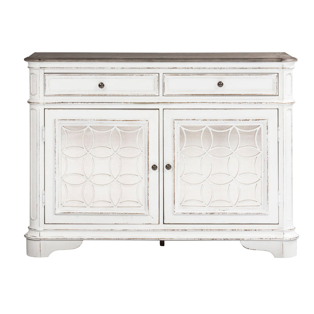 Make entertaining easy and stylish with the Magnolia Manor Buffet. Crafted of poplar solids with white oak and birch veneers. The buffet top features a weathered brown finish accented by an antique white with heavy chipping. Two fully stained full extension drawers with felt lining create storage galore when combined with the two antique mirrored doors that feature one adjustable shelf behind each doors. The mirrored doors offer design flexibility with a decorative grid insert and the option to switch the mirrored door to a wood panel. Canted corners and bead molding round out this beautiful piece that works in any decor from farmhouse to cottage living.