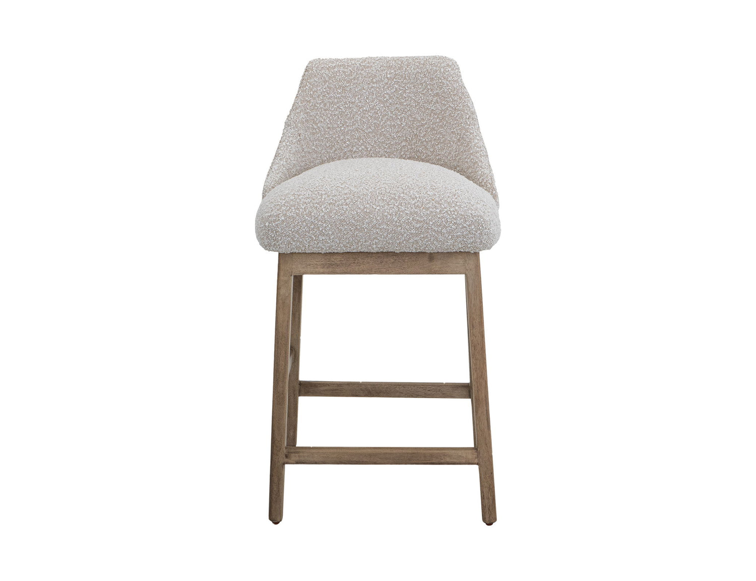 Wooden Frame and Upholstered Seat, Barstool. The Emma stool collection boasts a sleek, modern design that seamlessly combines style and practicality. It features a sturdy wooden frame with a natural finish, offering a warm and timeless appeal. The seat and backrest are upholstered in a light, textured fabric, providing added softness and comfort. The design showcases clean lines, four tapered legs, and crossbars for enhanced stability, making it suitable for relaxed, modern-inspired interiors. This stool is ideal for bars, kitchen counters, or casual seating.