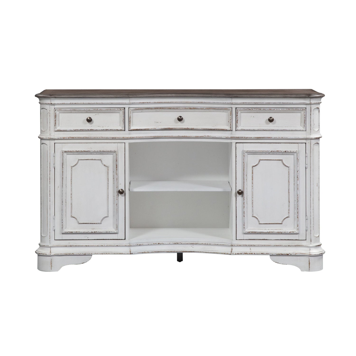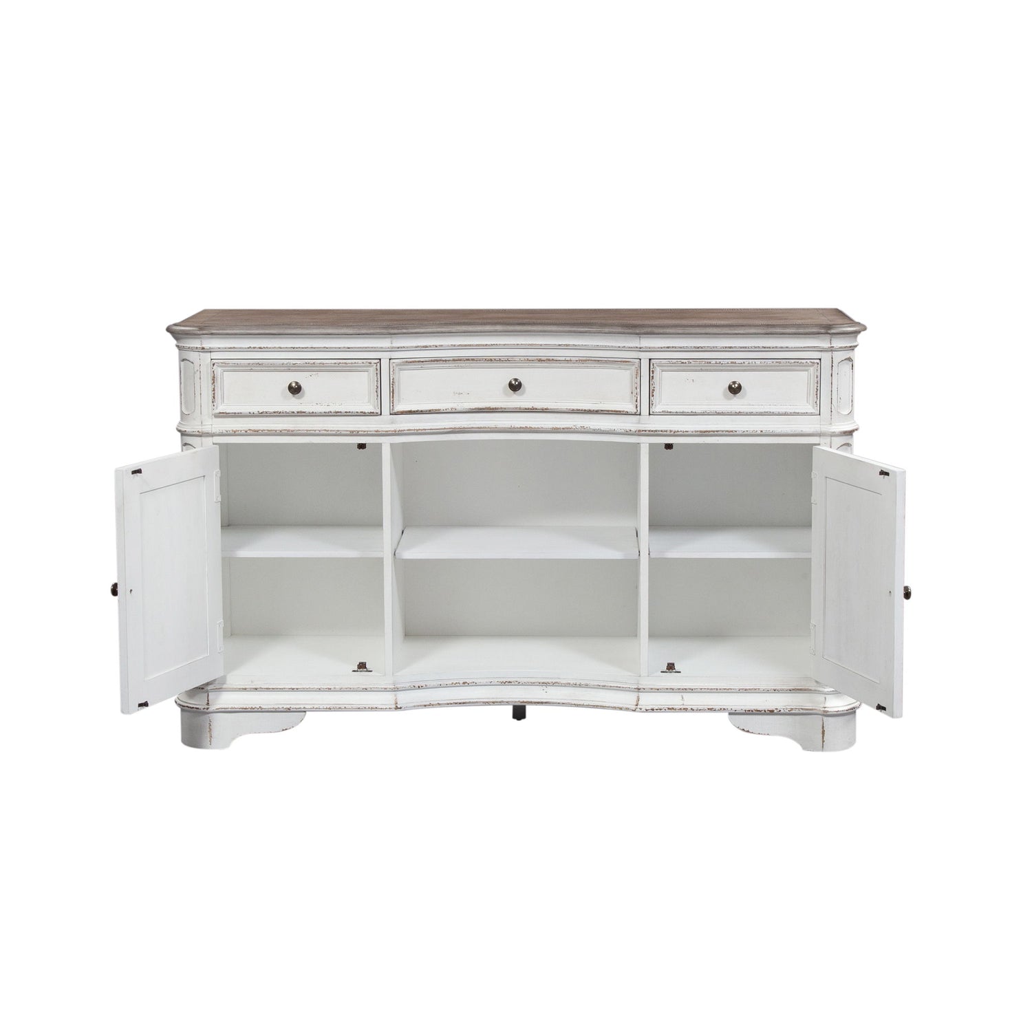 Indulge in the perfect blend of European design with the Magnolia Manor server. Crafted of poplar solids with white oak and birch veneers, this piece features fully stained full extension drawers with felt lining for easy access to storage, a centered concave top drawer flanked by two storage drawers and doors, a convenient center shelf for added storage, and is accented by antique pewter knob hardware. Storage abounds with an adjustable shelf located behind the two doors, the center open area with an adjustable shelf, and the wood framed drawers. The attention to detail is impeccable with the weathered brown finish accented by whitewash, the canted corners, rounded pilasters, and bead molding anchored down by the bracket feet. Warm antique finishes and artistic distressing along with grand scale a group to be passed to generations.