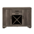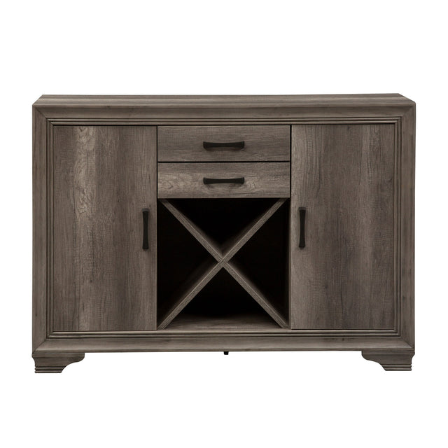 Accent your space with the Tanners Creek server. Crafted of a rubberwood solid frame and melamine, this piece features a Greystone finish, a removable X wine storage, two center drawers flanked by two doors, adjustable shelving behind each door for user customization, tapered legs, and is accented by antique brass bar pull hardware. The melamine is scratch resistant, making this piece sure to last in any home. Tanners Creek offers a natural feeling created by the living space as well as the furnishings that attribute to it.