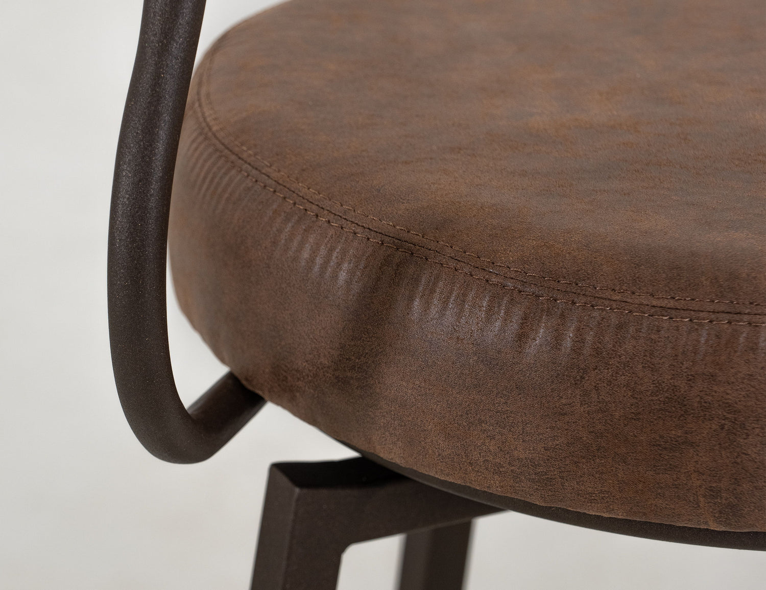 Barstool. Elevate your special space with our modern industrial bar stool, designed for both style and comfort. The seat is upholstered in faux leather, offering a sleek brown finish that enhances any decor while providing a comfortable sitting experience. The backrest features an elegantly curved wooden panel, adding a warm, natural touch to the stool's contemporary aesthetic. Crafted with a sturdy metal frame, this bar stool ensures durability and stability for everyday use. With four sleek and robust metal legs arranged in a slightly flared design, it provides added stability, making it the perfect addition to your kitchen, dining area, or bar. Transform your seating arrangement with this stylish and functional piece.