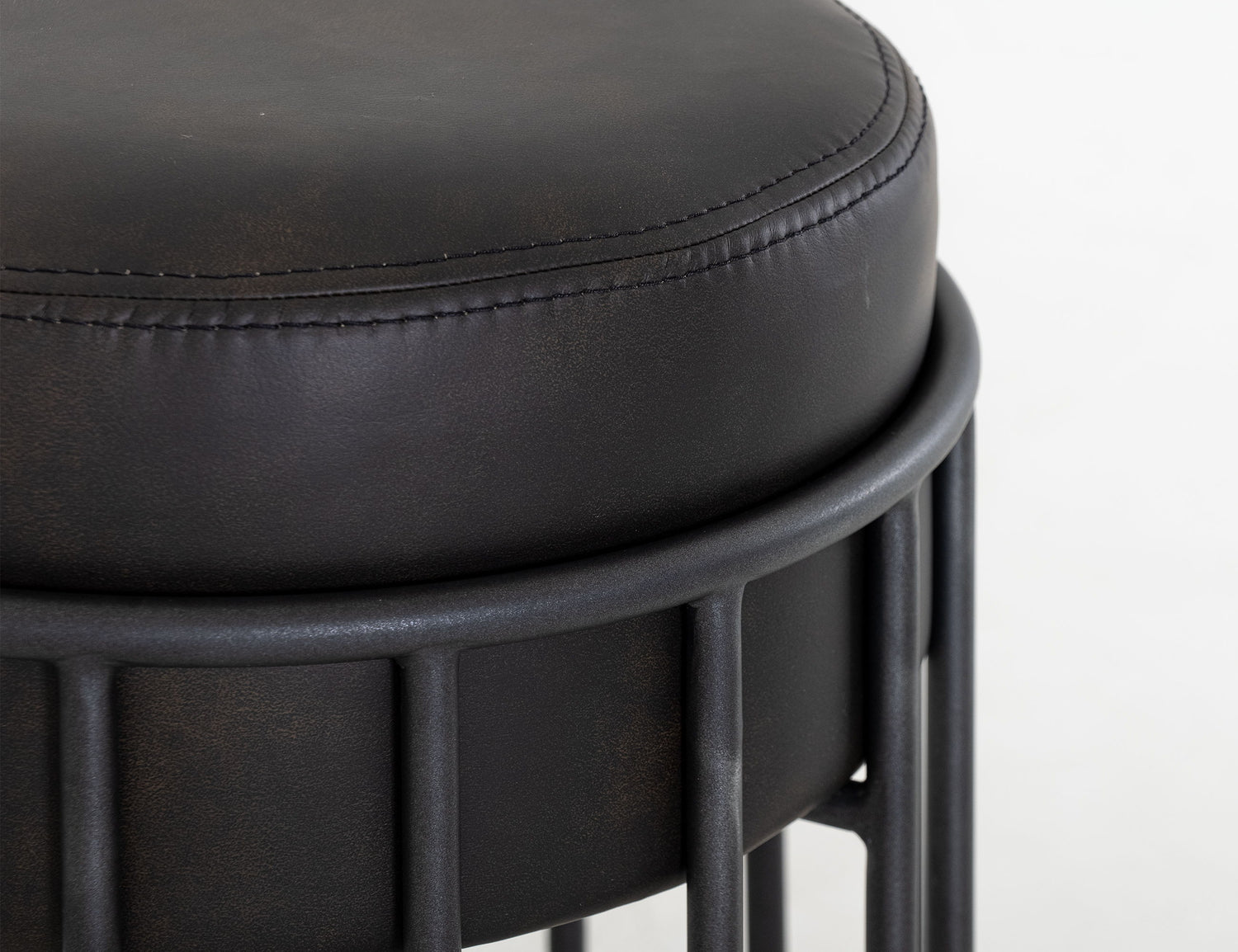 Wooden Frame & Metal Base, 30" Upholstered Barstool. Elevate your space with the stunning Merlin Barstool, a perfect blend of modern design and comfort. This stylish piece features a round, cushioned seat upholstered black faux leather, providing a luxurious and inviting seating experience. The stool's unique cylindrical metal base is adorned with vertical bars and a circular support ring, creating an eye-catching cage-like structure that enhances its contemporary and industrial aesthetic. It features a powder-coated metal frame in a black matte finish; the Merlin barstool resists chipping and ensures long-lasting durability. It is an ideal addition to any room, whether you're looking to complement your kitchen island, home bar, or stylish workspace. Experience the perfect combination of form and function with this exquisite stool.
