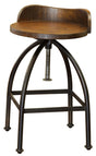 Wooden Seat Adjustable 24-30" Swivel Iron Base Barstool. Introducing our adjustable swivel Pueblo barstool. You'll love the industrial feel of its matte black iron base and the way it's complemented by its wooden curved low back seat. Its iron base can be adjusted from 24 inches to 30 inches, making it perfect for your counter-height or bar-height table.