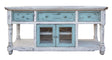- A white antiqued finish is applied using a hand-rubbed technique in a multi-step process. Doors and drawers feature a sky blue tone.