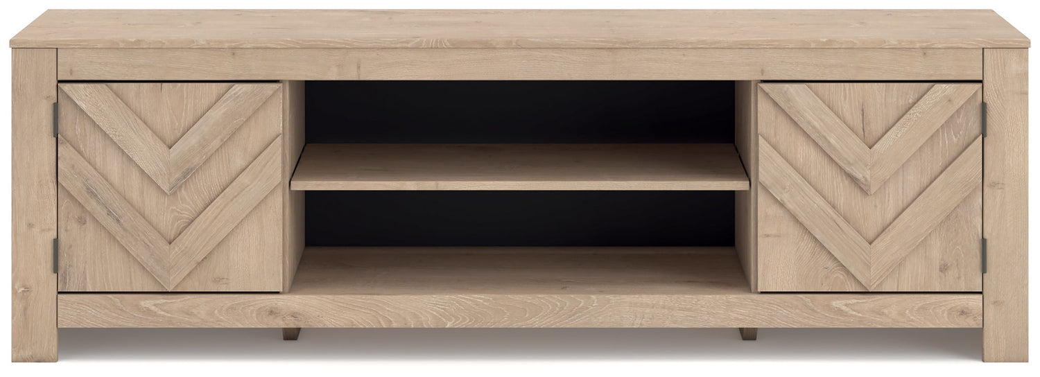 This TV stand embraces a classically charming aesthetic and repurposes it for modern living. Its finish to your love of vintage character, while the chic chevron pattern is effortlessly on trend. And with hidden storage behind the doors, your media accessories stay tucked away in style.