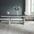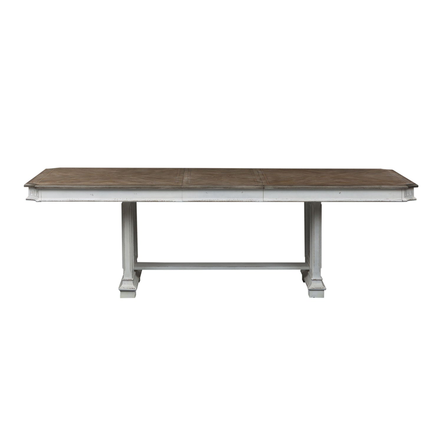 It’s never been easier to be elegant with the Abbey Park trestle table. Crafted of poplar and rubberwood solids with cathedral white oak and birch veneers, this set features an antique white finish with heavy chipping and destressing and a weathered brown with whitewash top. The table has a fancy face veneer design on the top with shaped corners and fluted accents, anchored by a raised panel pedestal base with a center trestle. Blending of European traditional design influences makes Abbey Park a truly unique style for any living space.