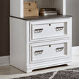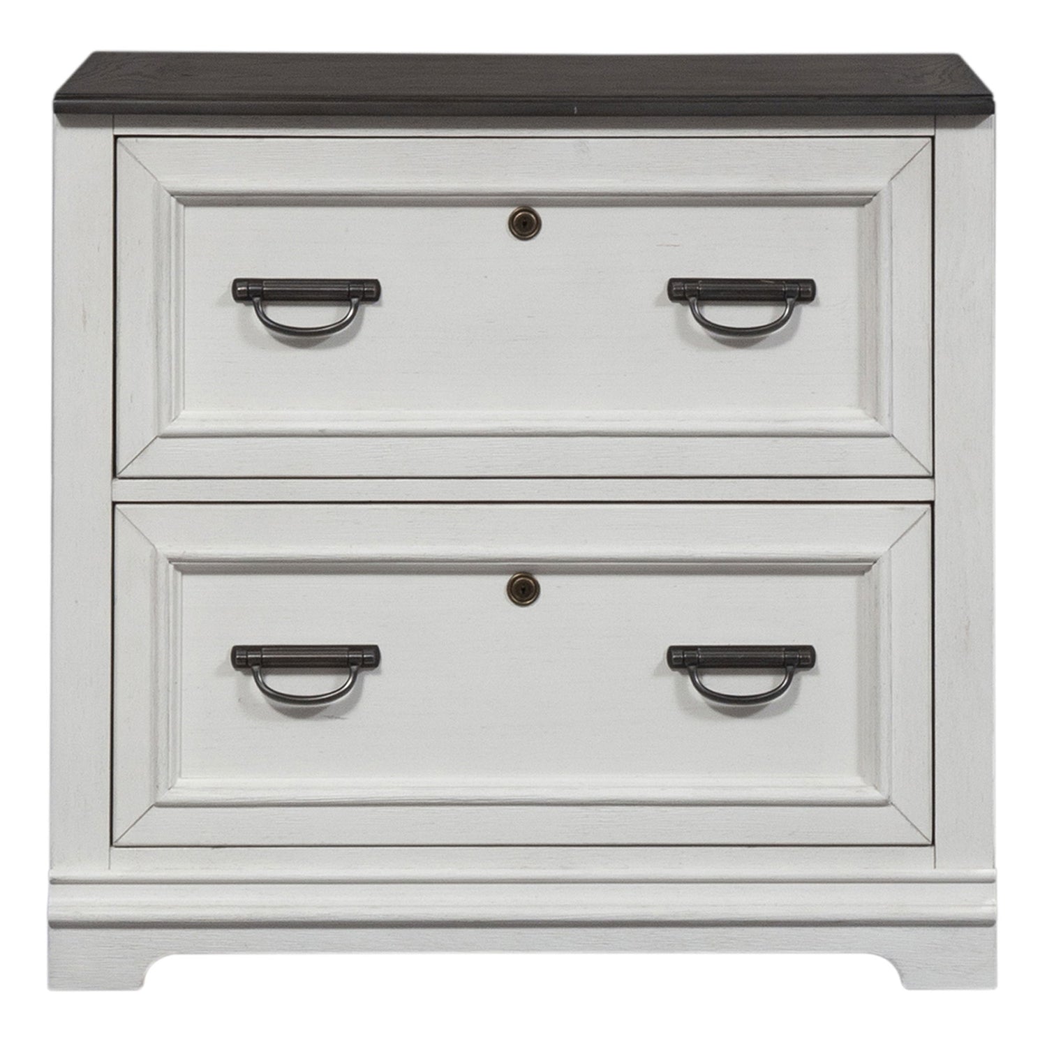Work from home in style with the Allyson Park bunching lateral file cabinet. Crafted of pine solids with cathedral white oak tops and pine veneers, this piece features a wire brushed white finish with charcoal tops, full extension drawer glides on the two locking file drawers for easy access to storage, bottom case dustproofing to ensure longevity of contents, planked top, and is accented with antique pewter drop bail hardware. Pair with the bunching lateral file hutch to complete the set, or let this piece stand alone.