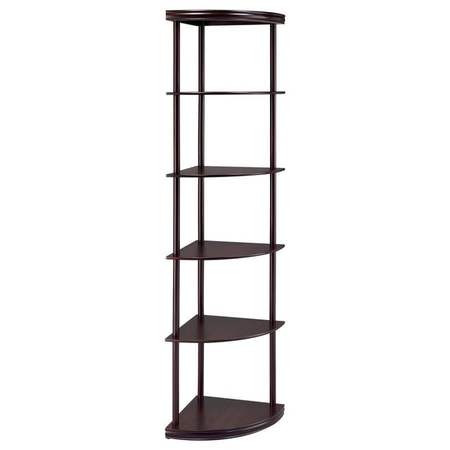 The Bonwick 5-Shelf Corner Bookshelf is a smart and stylish way to maximize space in your living room, office, or bedroom. Designed to fit neatly into corners, it combines functionality with timeless charm. With five sturdy shelves, it provides ample space for books, plants, photos, and decorative accents while maintaining an uncluttered look. Its rubberwood construction ensures durability, and the rich cappuccino finish brings warmth and elegance to any setting. Whether you’re organizing an office or adding decorative flair to a living space, this corner shelf is both practical and visually appealing.