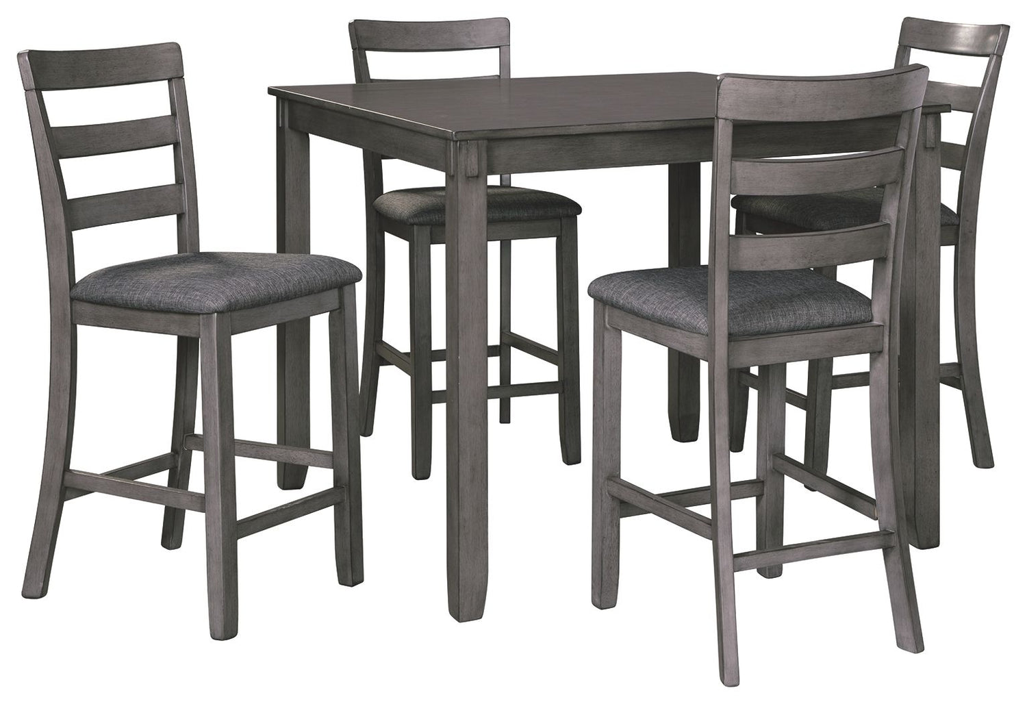 It’s so easy being gray—at least this 5-piece dining set makes it seem that way. This transitional counter-height table and barstool ensemble sports a charcoal gray finish with textured gray upholstery for an on-trend and relevant appeal. Plushly upholstered seat cushion in a practical polyfiber makes it a pleasure to linger at the table. Best of all, square table design is ideally suited for small spaces.