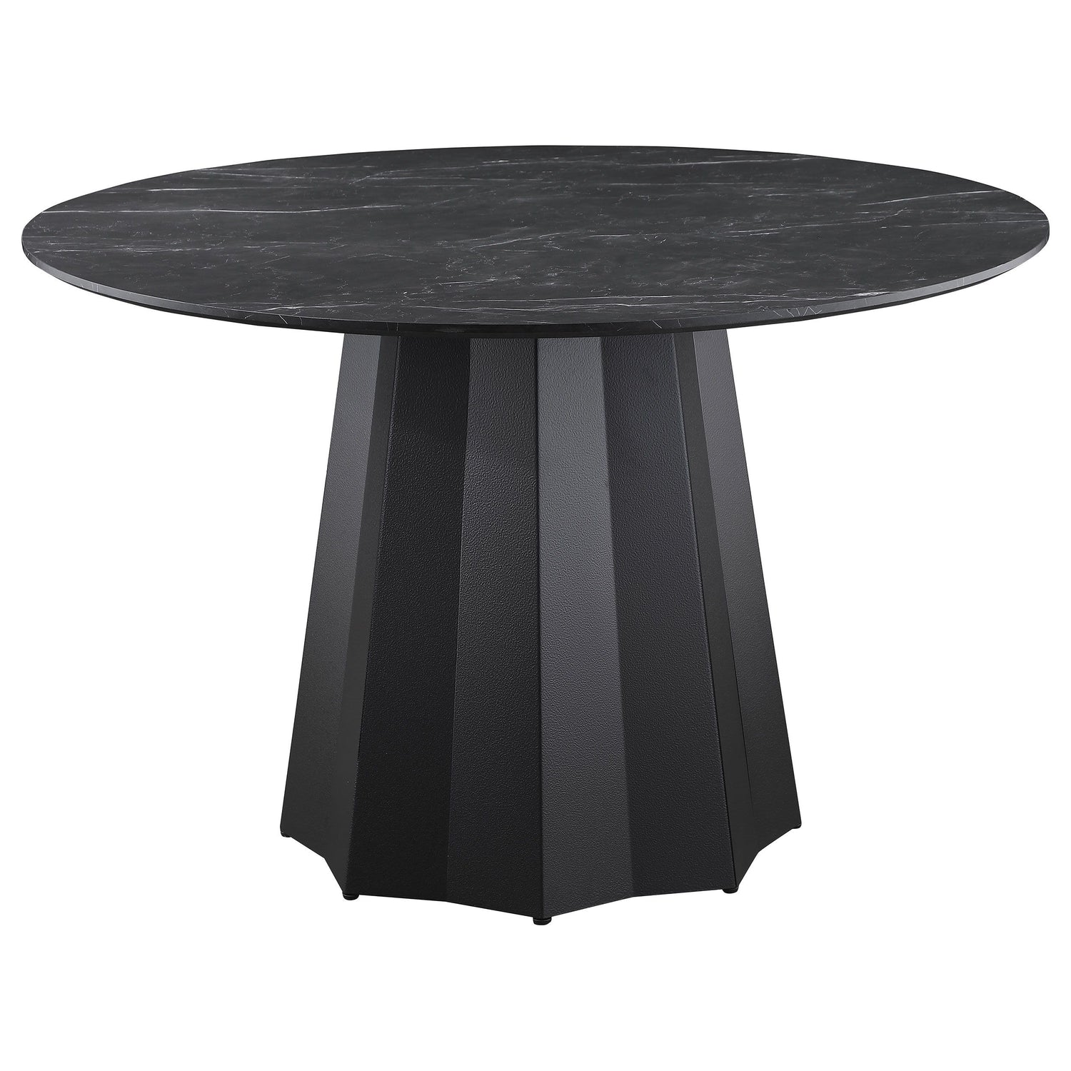 Punctuate your home with the luxurious look of a faux marble dining table, bringing the classic modern look of black marble and black metal into your space. This affordable table features a marble printed melamine top that adds a sense of sophistication to its timeless, classic silhouette. The table is upgraded with a bold tapering pedestal design, and its round top provides a unifying look and feel. The geometric form of the table's base creates a scalloped effect, adding a sense of depth and dimension. The base features a crisp black finish, complemented by hammered tone metal legs that add a touch of texture and an industrial chic to the dining table. This table can comfortably accommodate 4 people, making it a perfect addition to your dining room.