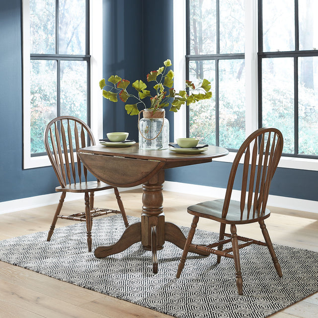 Create the décor of your dreams with the Carolina Crossing three-piece drop leaf set. Crafted with excellence using rubberwood solids. Includes the drop leaf table and two Windsor side chairs. The table has two 8” drop down leaves, allowing the user to save space when needed. The pedestal base is heavy turned and is supported by shaped splayed feet. The chairs have a Windsor back and saddle shaped seat for added comfort. The turned splayed legs feature nylon chair glides to protect your flooring. Perfect for smaller dining areas, the Carolina Crossing three-piece drop leaf set offers a sense of history yet feels fresh and today.