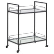 The Curltis 2-Tier Rectangular Glass Shelf Metal Bar Cart in black combines sleek contemporary design with practical functionality. Featuring a slim hammered metal frame, tempered glass shelves with raised edges, and caster wheels for mobility, this serving cart offers a stylish way to transport drinks, glassware, and snacks. Perfect for entertaining or adding extra storage in compact apartments, the Curltis bar cart provides durable, versatile, and eye-catching design for modern living spaces.