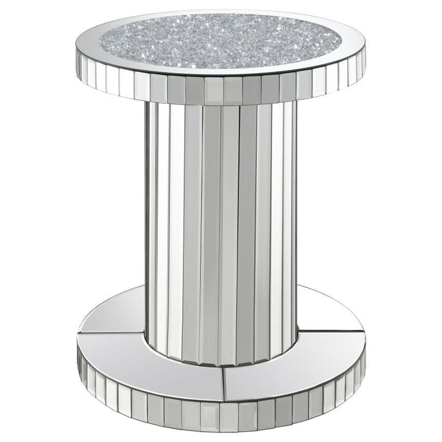 Dorielle Round Mirrored Acrylic Crystal Side Table – Silver Glam Accent Pedestal Table for Living Room, Bedroom, or Luxe Contemporary Spaces