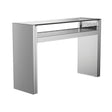 The Edna console table features mirrored panels and a floating tempered glass top, accented with faux crystals. Its silver finish and geometric lines bring luxurious sophistication and reflective elegance to any entryway or living space.