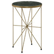 The Eliska accent side table showcases a round, solid green marble top inset within a gleaming antique gold frame. Its polished surface adds elegance and sophistication, serving as a refined space for displaying décor, setting down drinks, or enhancing interiors with timeless natural stone beauty.