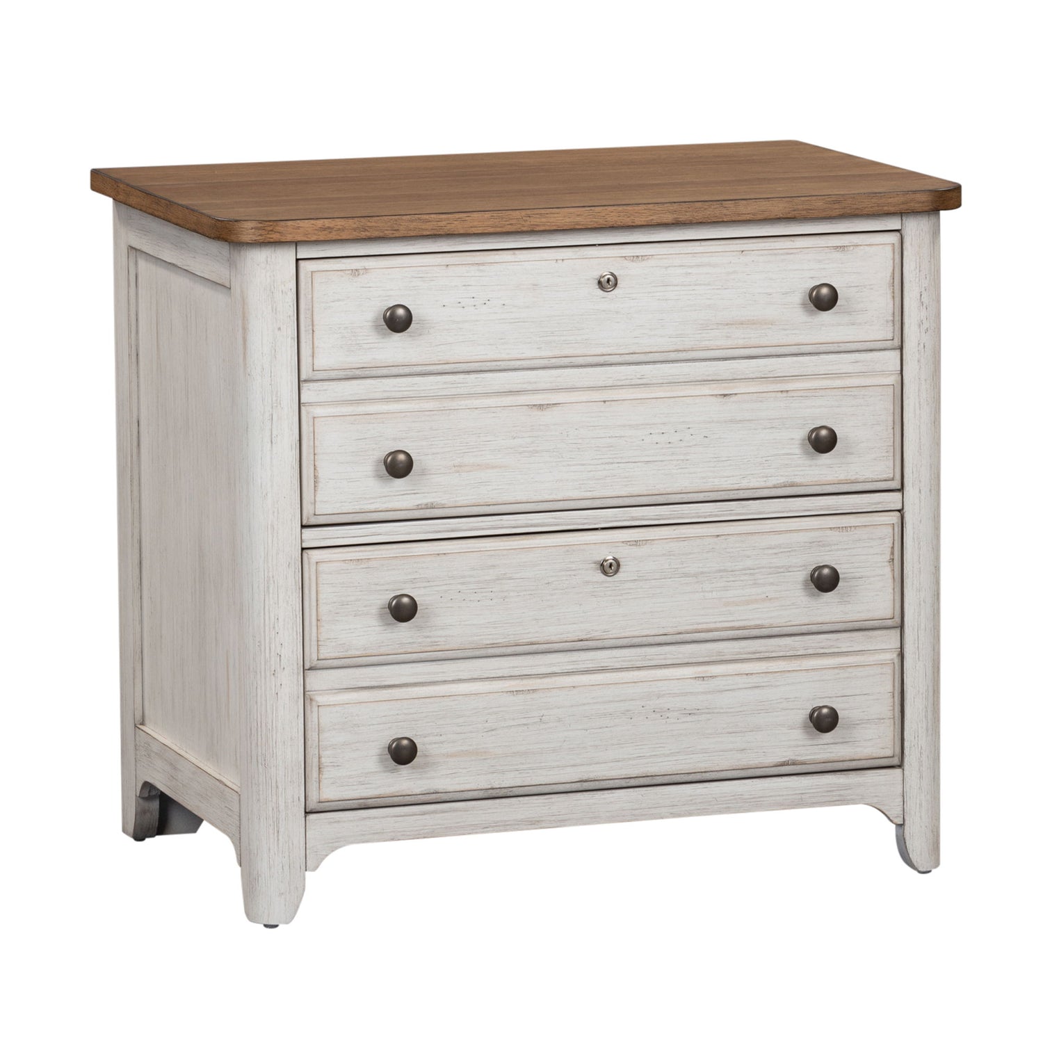 Enhance your office space with the Farmhouse Reimagined lateral file. Crafted of pine solids with hickory and pine veneers, this piece features a two toned antique white finish with chestnut tops, two full extension locking storage file drawers for easy access to storage, fully stained interior drawers, chamfered drawer fronts, heavy distressing, and is accented by antique brass knob hardware.