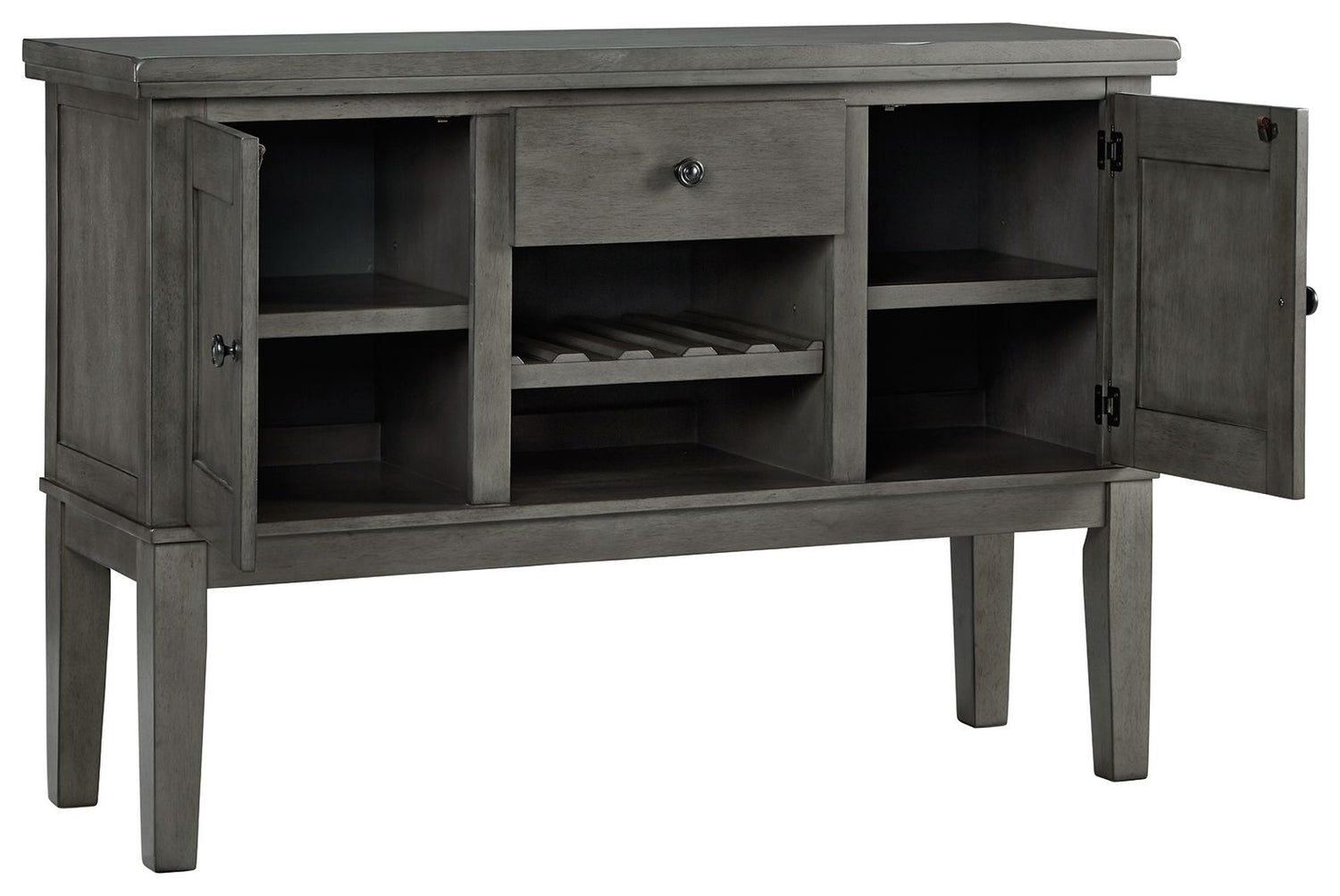 Cool and on-trend. This versatile server sports an antiqued gray color for a contemporary-yet-casual feel. The server features two cabinets, a smooth-gliding drawer and an open cubby with a wine rack, making it a breeze to clear away clutter and expand your serving space. Dining with friends and family has never been so stylish.