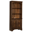 This traditional style bookcase is enhanced with beautiful molded detailing. Two bottom cabinet drawers offer concealed storage for small items. Three open shelves allow you to neatly organize your items. Molded accents on the frame and a curve at the top create an elegant display. This bookcase with doors is finished in burnished oak and supported on bracket style legs.