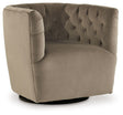 This swivel accent chair balances ultra-soft seating with a luxe appearance. Settle into the barrel back and indulge in its velvet fabric. Keep up with conversations with a sleek 360-degree swivel. This chair is created with both functionality and affordable luxury and in mind—how perfectly suited to your contemporary lifestyle.