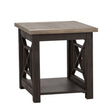 Accent your space with the Heatherbrook end table. Crafted of poplar solids and acacia veneers, this piece features a charcoal and ash finish, bottom shelf for additional storage, appealing open grid end panels, anchored by a block leg design. This unique end table would be a wonderful accent piece in any home.