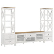 Upgrade your living area with the Hollis 3 Piece TV Stand Entertainment Center. Featuring a brown ash veneer top on a crisp white frame, this set offers both style and functionality. Symmetrical X-trellis media towers flank the TV stand for extra storage and display options, while drawers and shelves keep media accessories organized. Ideal for farmhouse, coastal, or cottage-inspired interiors, this entertainment center creates a charming and practical focal point for any home.