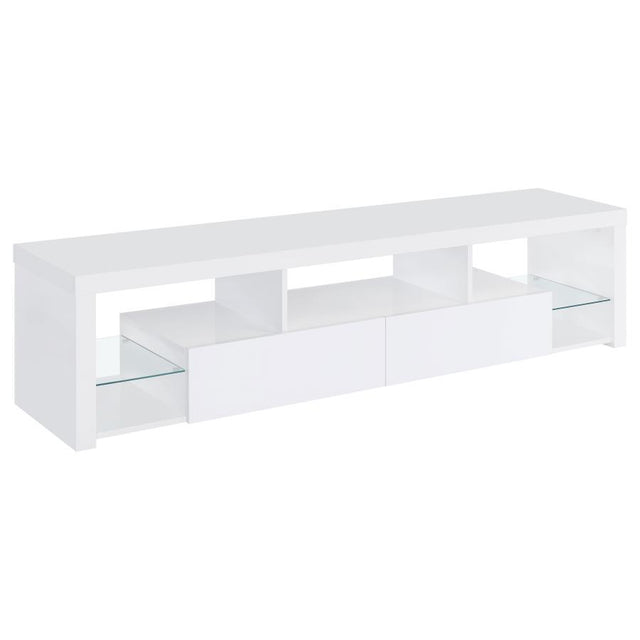 The Jude 2-Drawer TV Stand in High Gloss White delivers modern elegance and practical storage. Engineered wood construction ensures durability, while soft-close drawers and clear glass shelves provide versatile organization for electronics, media, and decor. Its minimalist design, clean lines, and glossy finish make it a standout piece for contemporary living rooms, apartments, or home theaters, offering both aesthetic appeal and functional performance.