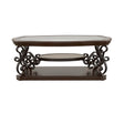The combination of dark bronze powder-coated legs, ornate scrollwork, and rich wood tones creates a sophisticated centerpiece. The refined rectangular shape fits beautifully in both traditional and transitional living room settings.