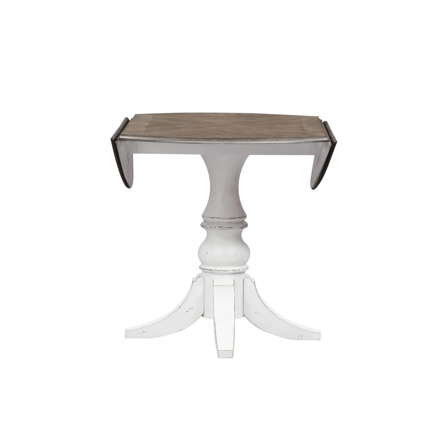 Gather in style with the Magnolia Manor drop leaf table. Crafted of poplar solids with white oak and birch veneers, this piece features the perfect blend of European design with a weathered brown top accented by whitewash, two drop down leaves allowing flexibility making this a perfect piece for a small dining space, splayed legs, a fancy face top, and a turned pedestal base. Warm antique finishes and artistic distressing along with grand scale a group to be passed to generations.