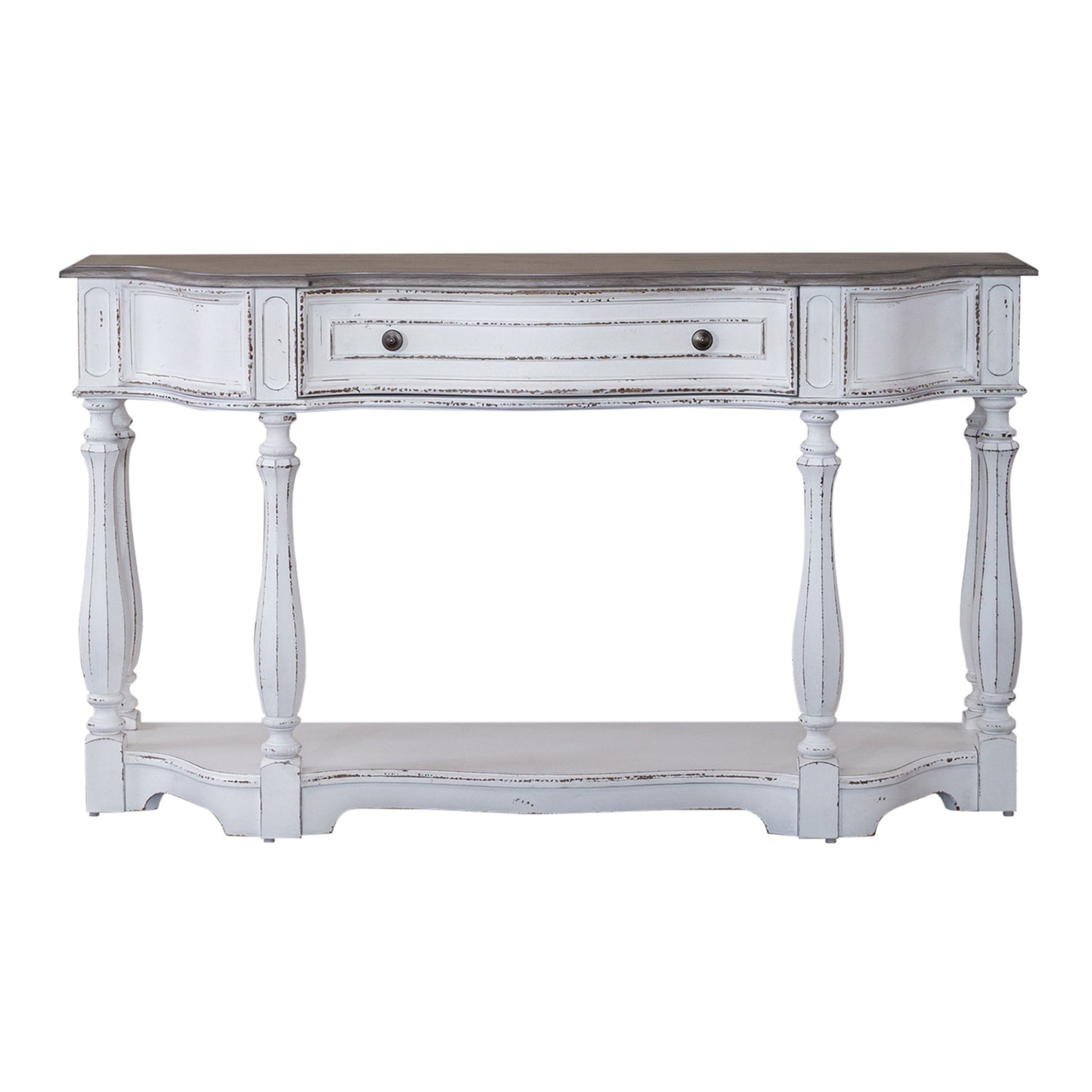 Accent your space with the traditional Magnolia Manor 56-inch hall console table. Crafted of poplar solids with white oak and birch veneers, this piece features an antique white finish with a weathered brown whitewash top, one full extension drawer and a bottom shelf for additional storage, anchored by faceted turned legs. This timeless console table will make a wonderful addition to your traditionally styled home.
