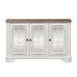 Accent your space with the perfect blend of European design with the Magnolia Manor hall console. Crafted of poplar solids with white oak and birch veneers, this piece features a fancy face top finished in a weathered brown with whitewash, canted corners on the front, bead molding, two adjustable shelves hidden behind three decorative wood framed mirrored doors, and is anchored by bracket feet. The hall console can be used as a decorative piece in an entry-way or as a tv stand! With today's modern technology in mind, users can enjoy the convenience of the built-in wire management provisions, perfect for accommodating DVD players or a gaming console. Warm antique finishes and artistic distressing along with grand scale create a piece to be passed to generations.
