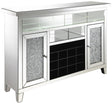 Elevate your entertainment space with the Melinda 2-Door LED Mirrored Wine Storage Bar Cabinet. Featuring mirrored surfaces, faux diamond inlays, and crystal knobs, this glamorous cabinet adds sophistication and sparkle to any dining or living area, becoming a striking focal point.