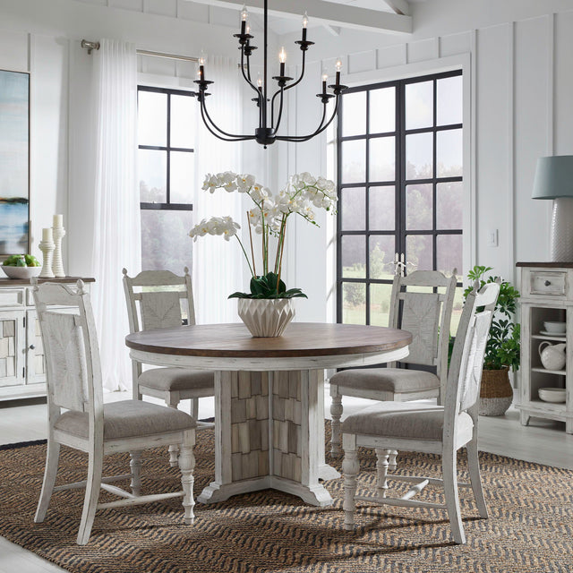 - Includes the Pedestal Table & 4 Panel Back Side Chairs