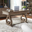 Work from home or the office in comfort and style with the Simply Elegant writing desk. Crafted of rubberwood solids and cathedral white oak veneers, this piece features a heathered taupe finish and is accented with antique brass knob hardware. The desk features three full extension wood framed drawers including a center drawer with a flip down keyboard tray, and is anchored by beautiful scrolled legs. The Simply Elegant collection creates an inviting combination of casual styling and elegant ambiance.