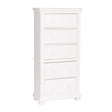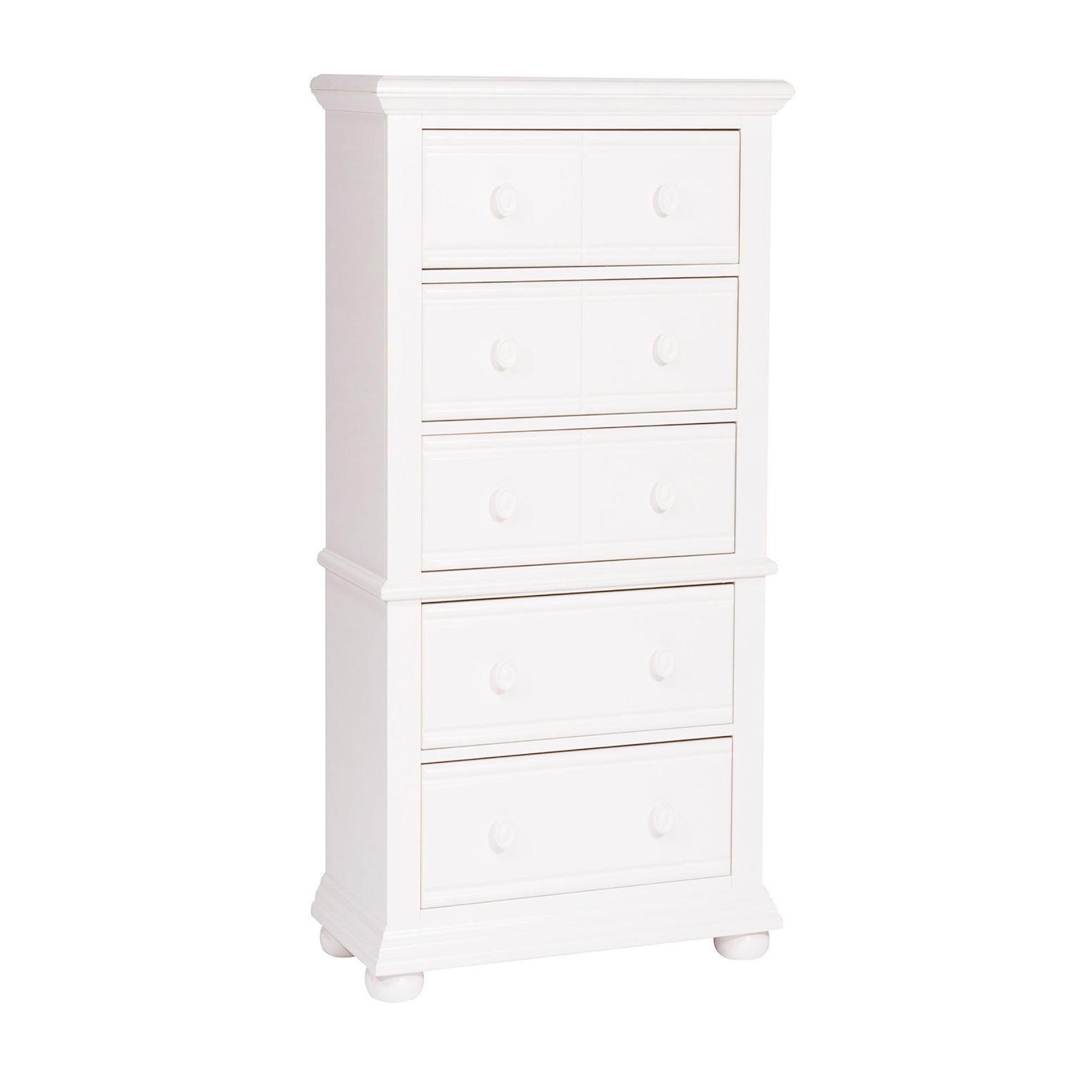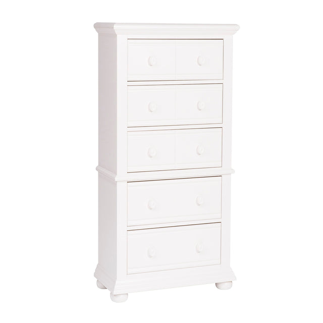 Obtain a fashionable cottage look with the Summer House 5 drawer chest. Crafted of pine solids with painted MDF, this piece features the best of cottage in an oyster white finish, bottom case dust proofing, fully stained interior drawers, full extension drawer glides for easy access to storage, bluff cut top drawers, bun feet, felt lined top drawers, and is accented by wood knob hardware.