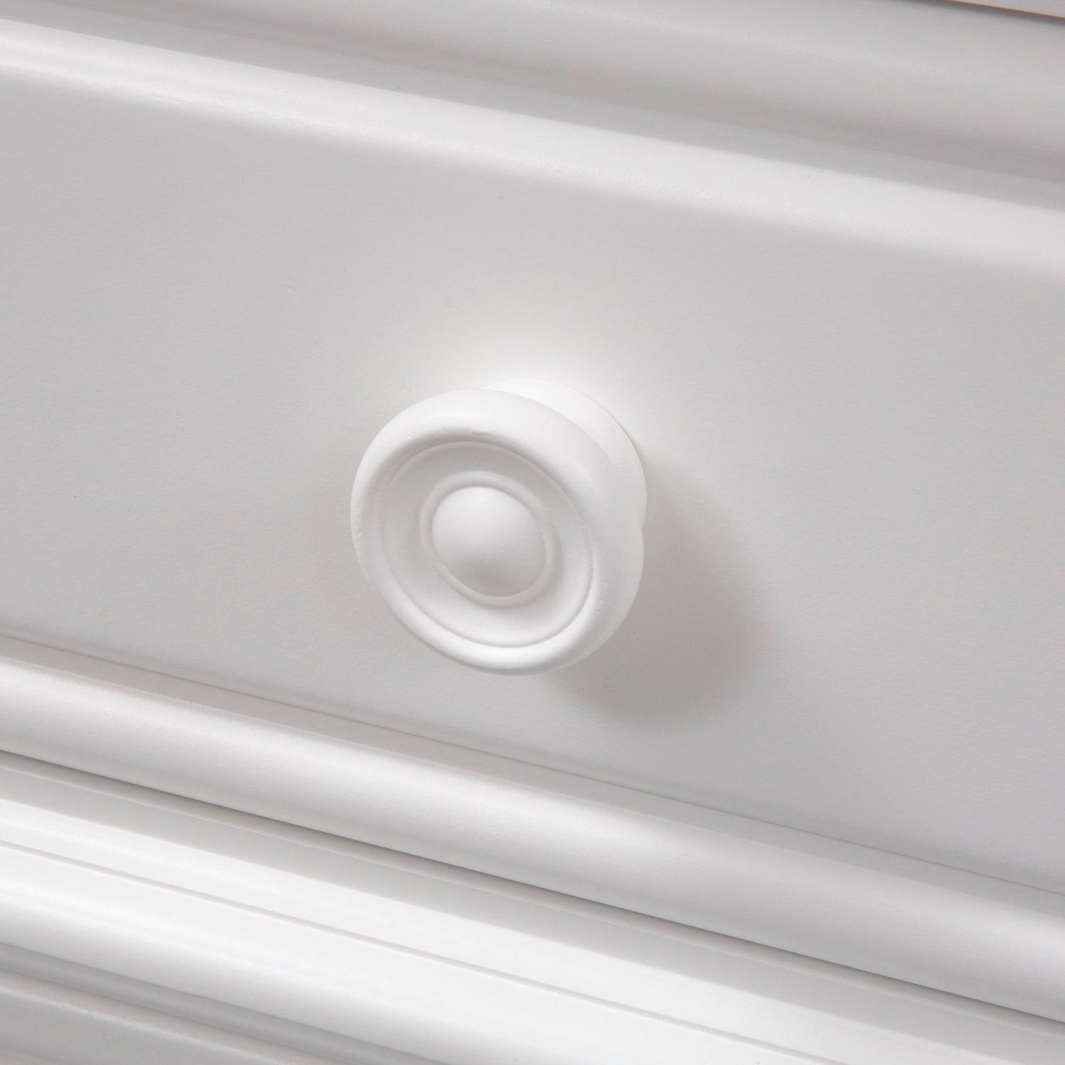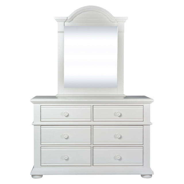 Live life beautifully with the Summer House I dresser and mirror. Crafted of poplar and pine solids this kit features an oyster white finish, bead molding, bun feet, full extension drawers with felt lined top drawers, and is accented with wooden knob hardware. The dresser has six drawers of storage and pairs well with the arched louvered panel mirror with a beveled edge and bolt-on supports. With cottage design always in fashion, make the Summer House I a staple in your home.