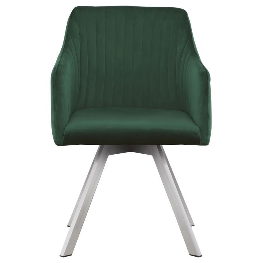 Four swivel armchairs upholstered in rich green velvet complement the table, offering comfort and style. Channel tufting enhances visual appeal, while the swivel functionality allows effortless movement and a touch of retro glamour.