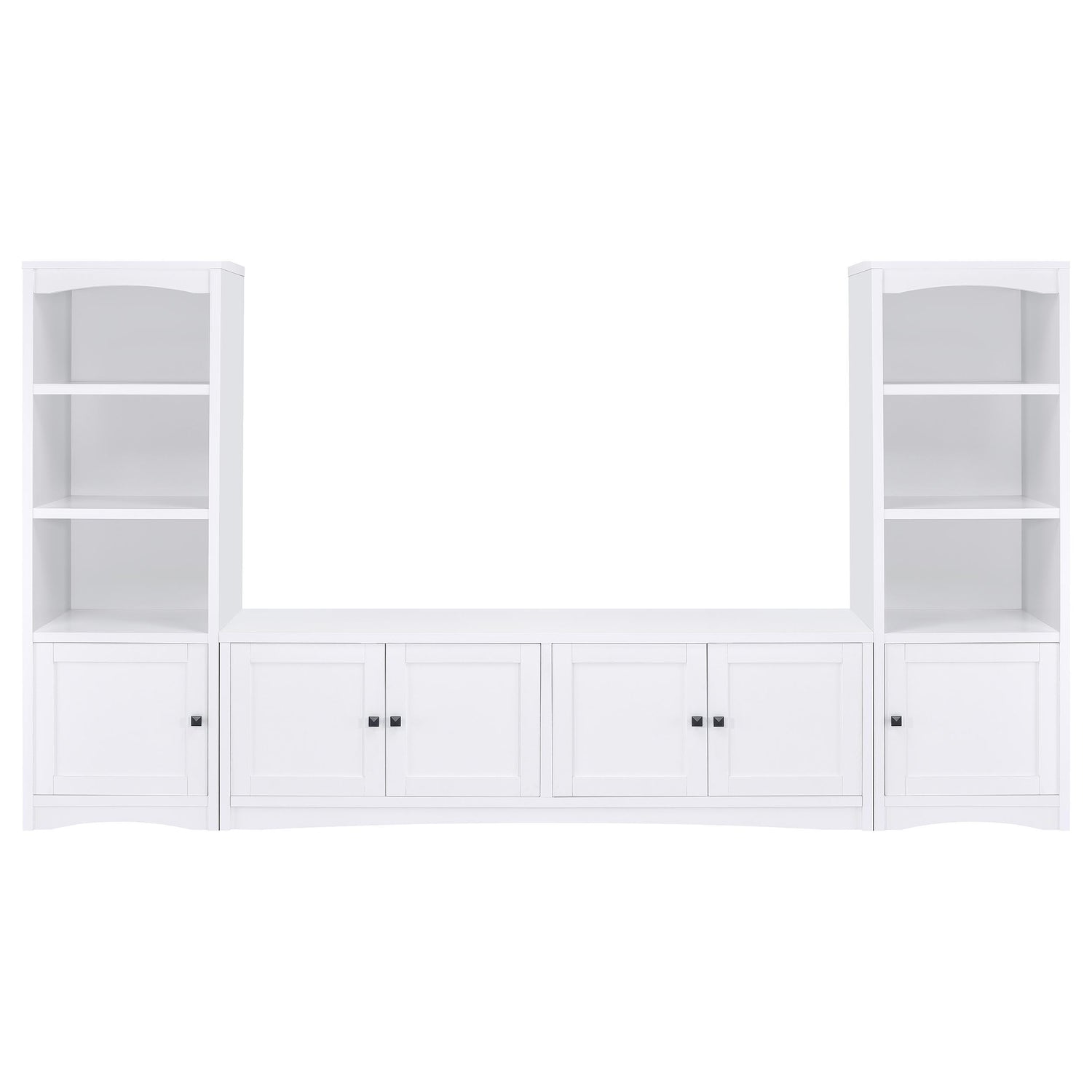 Transform your living space with this beautifully crafted entertainment center, designed to combine style and functionality for your media needs. Anchored by a 78-inch TV stand, this set is perfect for hosting up to an 80-inch television, offering a spacious and organized solution for your home. The TV stand features four doors that open to adjustable shelves, complete with cord management openings, making it easy to keep your media and gaming components neatly arranged. Flanked by two matching media towers, the entertainment center provides additional storage and display options with a mix of open shelving and concealed cabinet space. Finished in a warm, neutral tone, this entertainment center blends seamlessly with any decor, creating an inviting focal point in your living room.