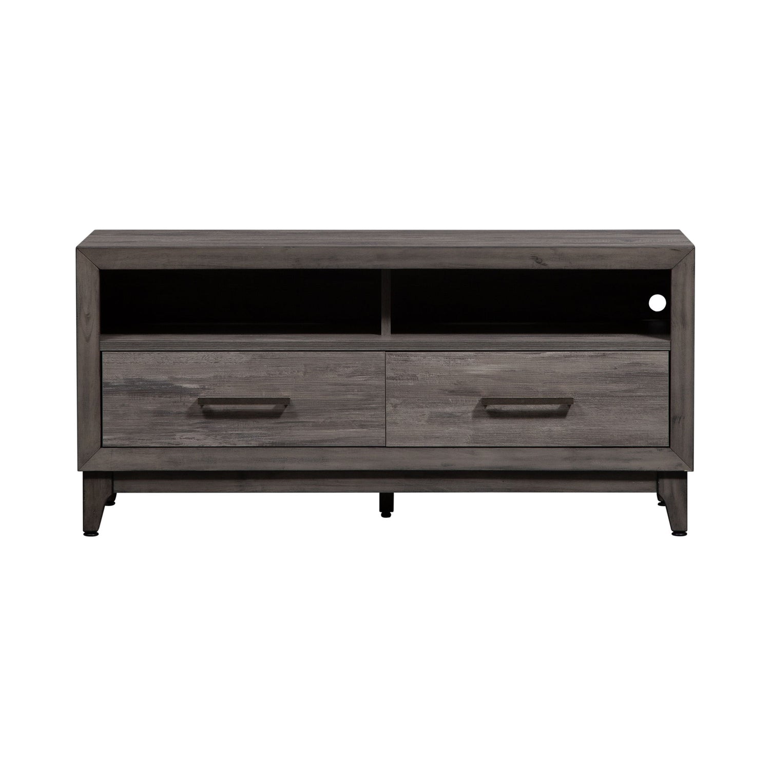 Contemporary and simplistic design are combined to create the Mercury TV console. Crafted with rubberwood solids and melamine, this piece accommodates most TVs and features a solid wood picture frame, antiqued pewter bar pulls hardware, 2 drawers, picture framed case anchored by tapered block style feet. The melamine is scratch resistant, sure to make this piece last in any home. The open compartment and wire management provisions effortlessly accommodate electronics or gaming equipment.