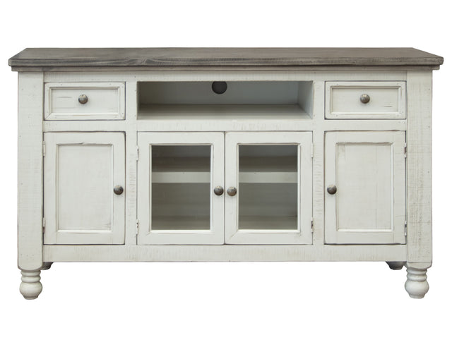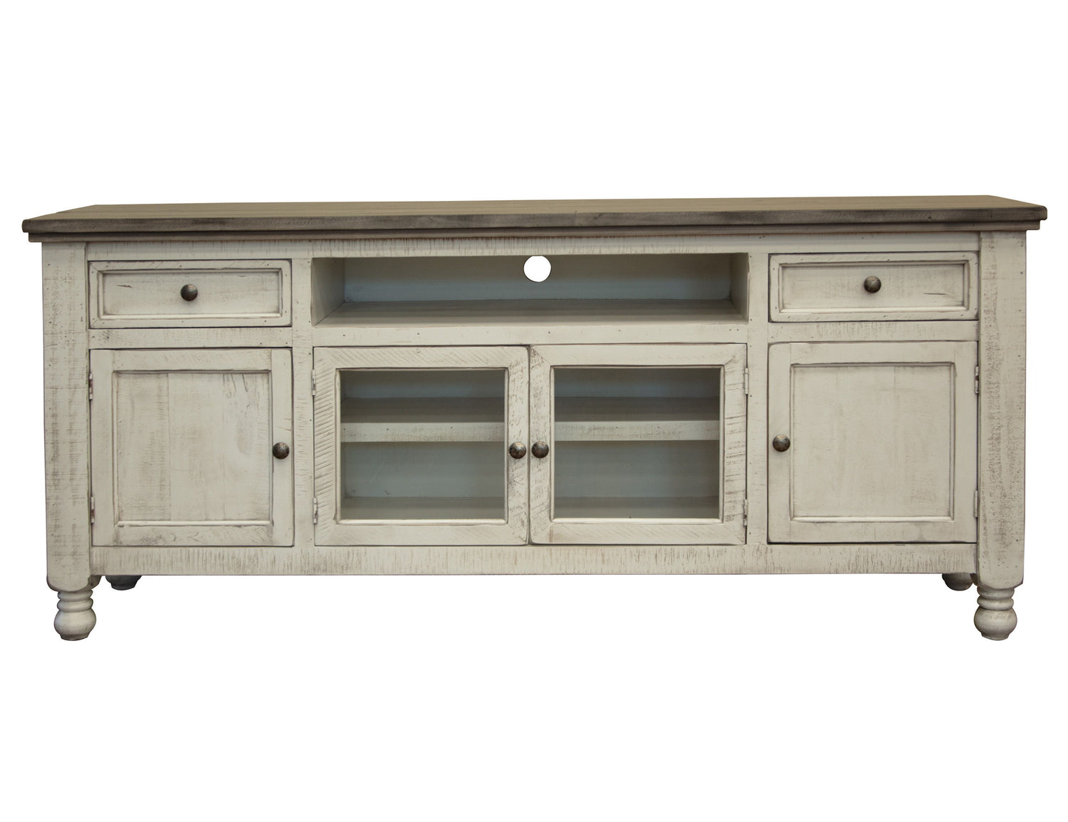 2 Drawer 4 Doors TV Stand. Exuding farmhouse chic with just the right touch of old-world charm, the Stone Collection is meticulously crafted from solid pine wood. The wood is lightly distressed, showcasing a white finish and complemented by weathered gray tops.