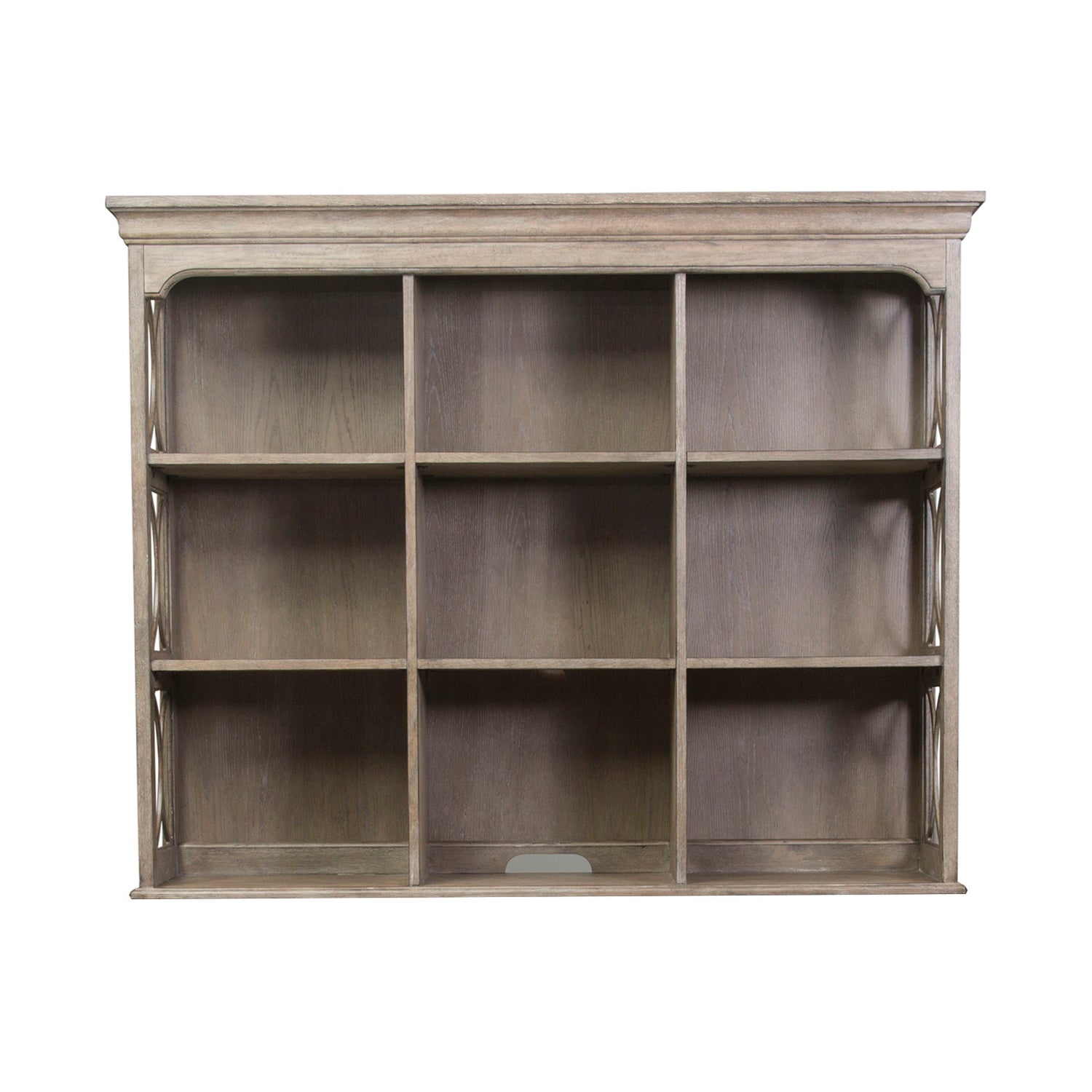 Invite casual styling and elegant ambiance into your space with the Simply Elegant credenza hutch. Crafted of rubberwood solids and cathedral white oak veneers, this piece features a heathered taupe finish. This hutch a total of nine fixed shelves for storage and display. The open grid pattern on the side panel add sophisticated design, and the wire management provisions allow your space to stay decluttered. The Simply Elegant collection creates an inviting combination of casual styling and elegant ambiance.