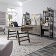 Work from home in style with the Modern Farmhouse complete desk. Crafted of poplar solids with knotty white oak veneers, the pieces feature heavy distressing, accented by washed brass elongated bar pull hardware. The writing desk features three fully stained full extension drawers, slat accents on the sides, and heavy block splayed legs. The leaning bookcases feature five fixed shelves, one fully stained full extension drawer, and block style pilasters. The credenza features three fully stained full extension drawers with the third drawer being a lateral file drawer with a bluff-cut drawer front, a geometric high/low pattern on the two doors, and one adjustable shelf behind each door. This set is available in an alternate finish, sure to compliment any space and make working from home a breeze.