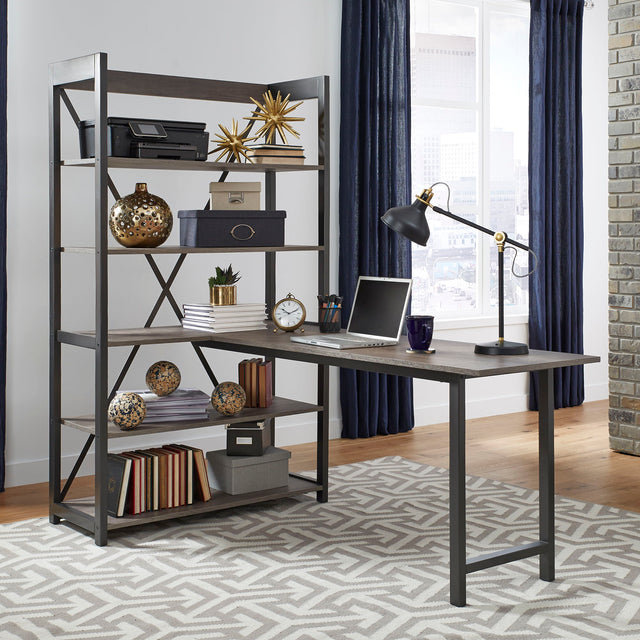 Work from home or your office in style with the Tanners Creek desk and bookcase set. Crafted of a rubberwood solid frame and melamine, this piece features a Greystone finish, open ends finished in a dark pewter metal finish, and a floating shelf design. Bookcase has X metal strip accent, desk bolts to bookcase for an L-shape feel. The melamine is scratch resistant, making this piece sure to last in any home. Tanners Creek offers a natural feeling created by the living space as well as the furnishings that attribute to it.