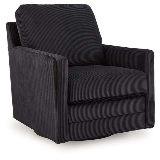 Clean-lined, contemporary style. Relaxed, homey comfort. This swivel chair has it all. Lightweight corduroy upholstery makes it a cozy yet head-turning piece. Factor in the 360-degree spin, and you've got a win-win.